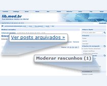 Neste documento você aprenderá mais a respeito da arquivação de artigos e comentários em seu lib.med.br.ArtigosComentários Iniciar apresentação de slides Artigos 1 Para que serve? A arquivação de posts e comentários é útil para o caso em que você não quer excluí-los, mas também não deseja mantê-los públicos. Basta arquivar o post ou comentário e ele ficará armazenado de modo que só você pode ter acesso. 2 Arquivar Você pode arquivar tanto um artigo publicado quanto um rascunho. Basta abrir a visualização do artigo e clicar em "Arquivar". 3 Ver posts arquivados Para acessar os artigos arquivados, clique em "Moderar rascunhos" no menu lateral. Depois basta clicar em "Ver posts arquivados". 4 Editar Clique em "Editar", na visualização do post arquivado, e será aberta a tela de edição para que você possa alterar o artigo. Ao clicar em "Publicar" ou "Rascunho", o artigo será publicado ou salvo em rascunho e não estará mais como arquivado. 5 Moderar A opção "Moderar" faz com que o post saia da lista de arquivados e fique salvo como rascunho. Você poderá acessá-lo em "Moderar rascunhos" e publicá-lo, se desejar. 6 Remover Para remover um artigo arquivado, clique em "Remover" e confirme a operação clicando em "OK". Comentários 1 Arquivar Você pode arquivar tanto comentários publicados, quanto comentários que estão aguardando moderação em "Moderar comentários". Basta clicar na opção "Arquivar". 2 Ver comentários arquivados Para acessar os comentários arquivados, clique em "Moderar comentários" no menu lateral. Depois clique em "Ver comentários arquivados". 3 Editar É possível editar um comentário arquivado clicando em "Editar". Faça as alterações na tela de edição aberta e clique em "Salvar". O comentário continuará como arquivado depois de salvo. 4 Moderar e remover Clicando em "Moderar", o comentário sairá da lista de arquivados e será salvo na moderação de comentários. Para remover um comentário, clique em "Remover" e confirme clicando em "OK".